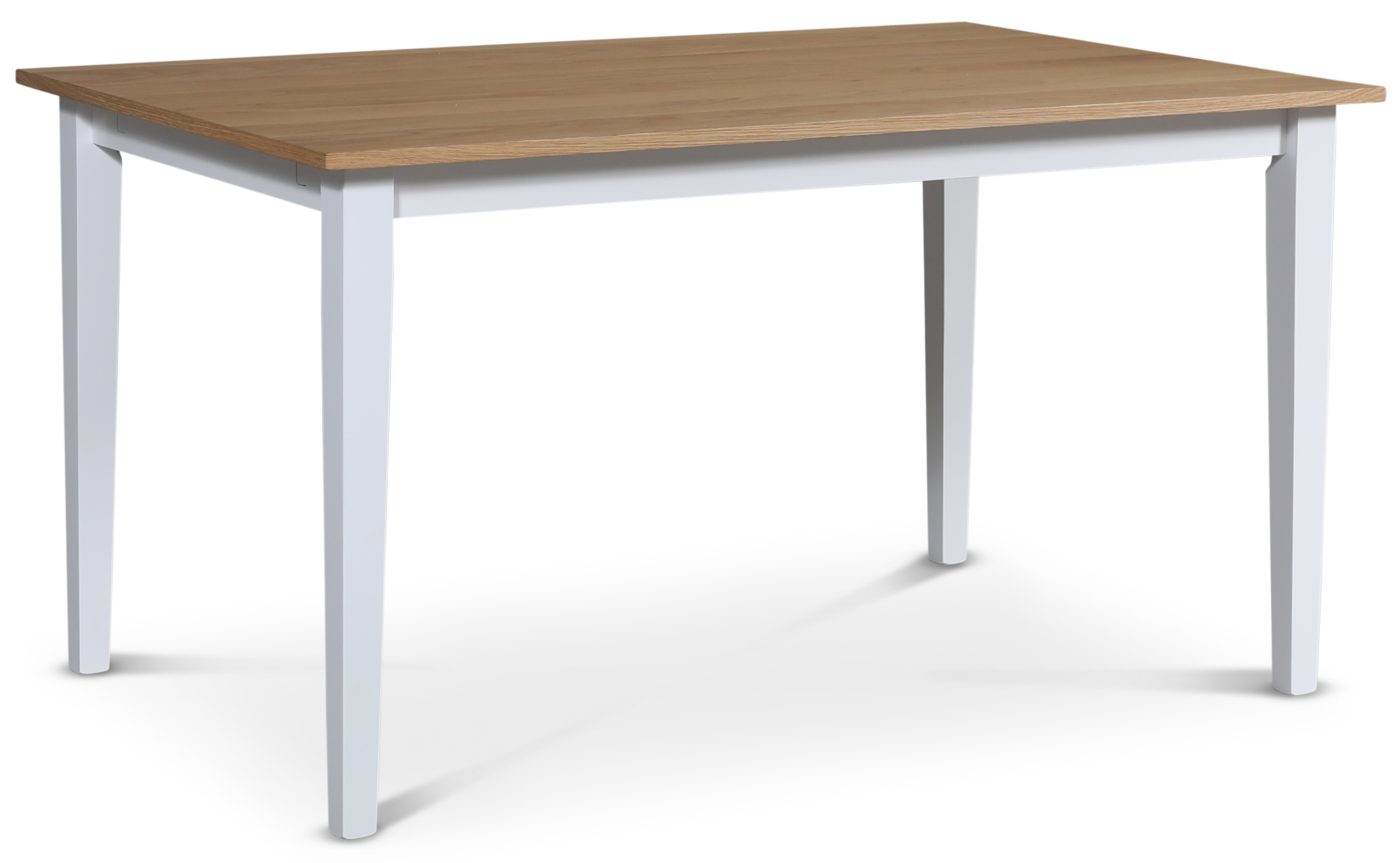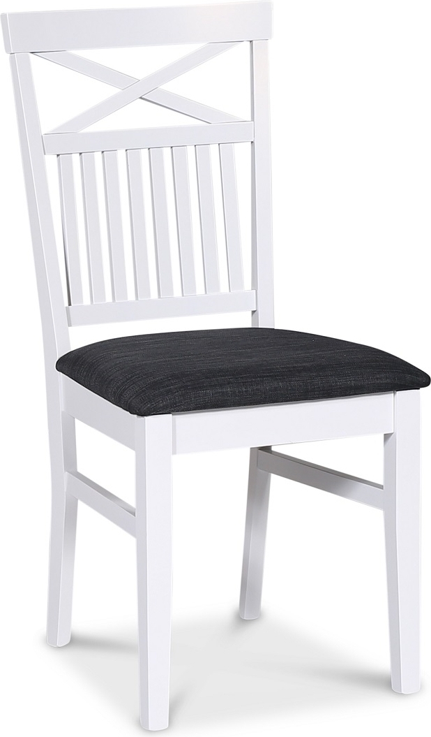 Fårö matgrupp från Skånska Möbelhuset, klassiskt matbord 140x90 cm med vitt underrede och en toppskiva i oljad ekfanèr. Det ingår 4 stycken matchande Fårö matstolar med kryss i ryggen och sits med gråt tyg. Stol i vitlackat trä.